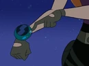 First appearing in "So the Drama ", the battlesuit is mainly white with light blue trim and a black belt with a purple holster on one side. Its final appearance was "Larry's Birthday ".